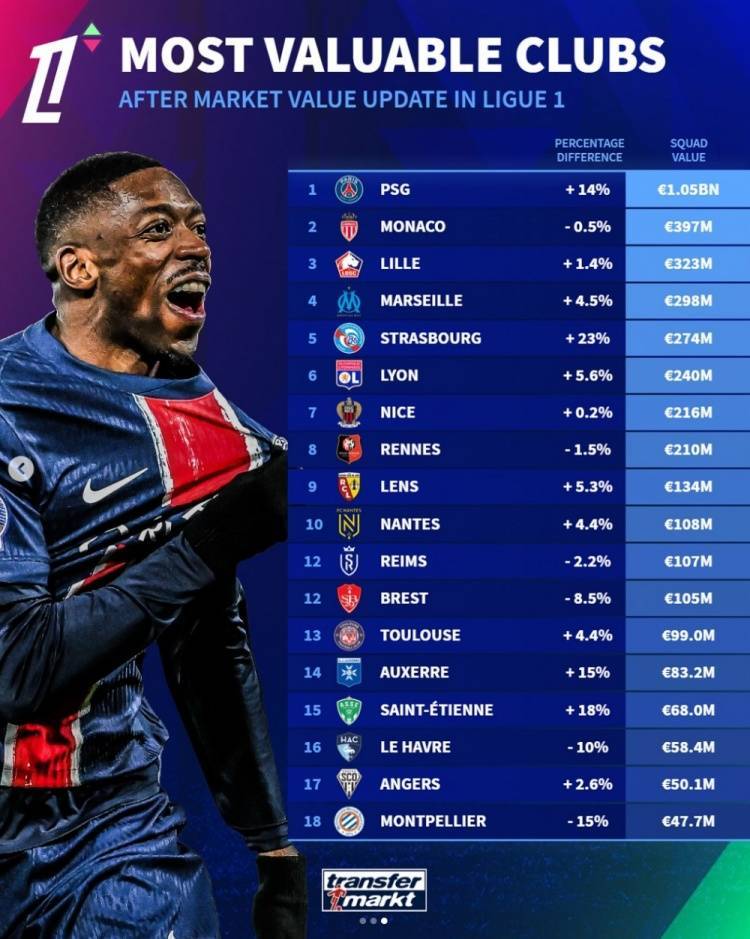 法甲球队身价排行:巴黎10.5亿欧居首,摩纳哥、里尔二三位